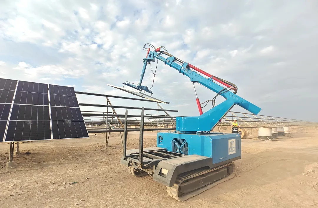 该项目规划装机容量500MW,同步配套建设75MW/150MWh储能系统,是当地“十四五”重点新能源工程。面对建设地风沙频发、气候恶劣等自然挑战,项目成立临时党支部,党员带头挑重担,在项目建设中,创新实施“错峰施工+分区攻坚”的协同作业管理模式,率先引入智能光伏组件安装机器人、桩基自动导航喷漆放点机器人等先进施工装备,通过管理模式与工程技术双轨创新,实现了施工效率与工程质量的同步跃升,在显著降低人员作业风险与材料损耗的同时,有力保障了项目按期高质量投运。
